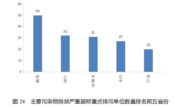 2018年,生态环保部公布了281家污染物排放严重超标重点排污单位名单。从地区分布看,严重超标企业主要集中在新疆、山西、内蒙古、辽宁、浙江等地,以上五省份企业数量之和达160家,占全国总数的56.94%。其中新疆企业数量最多,有50家,占全国总数的17.79%(见图24)。